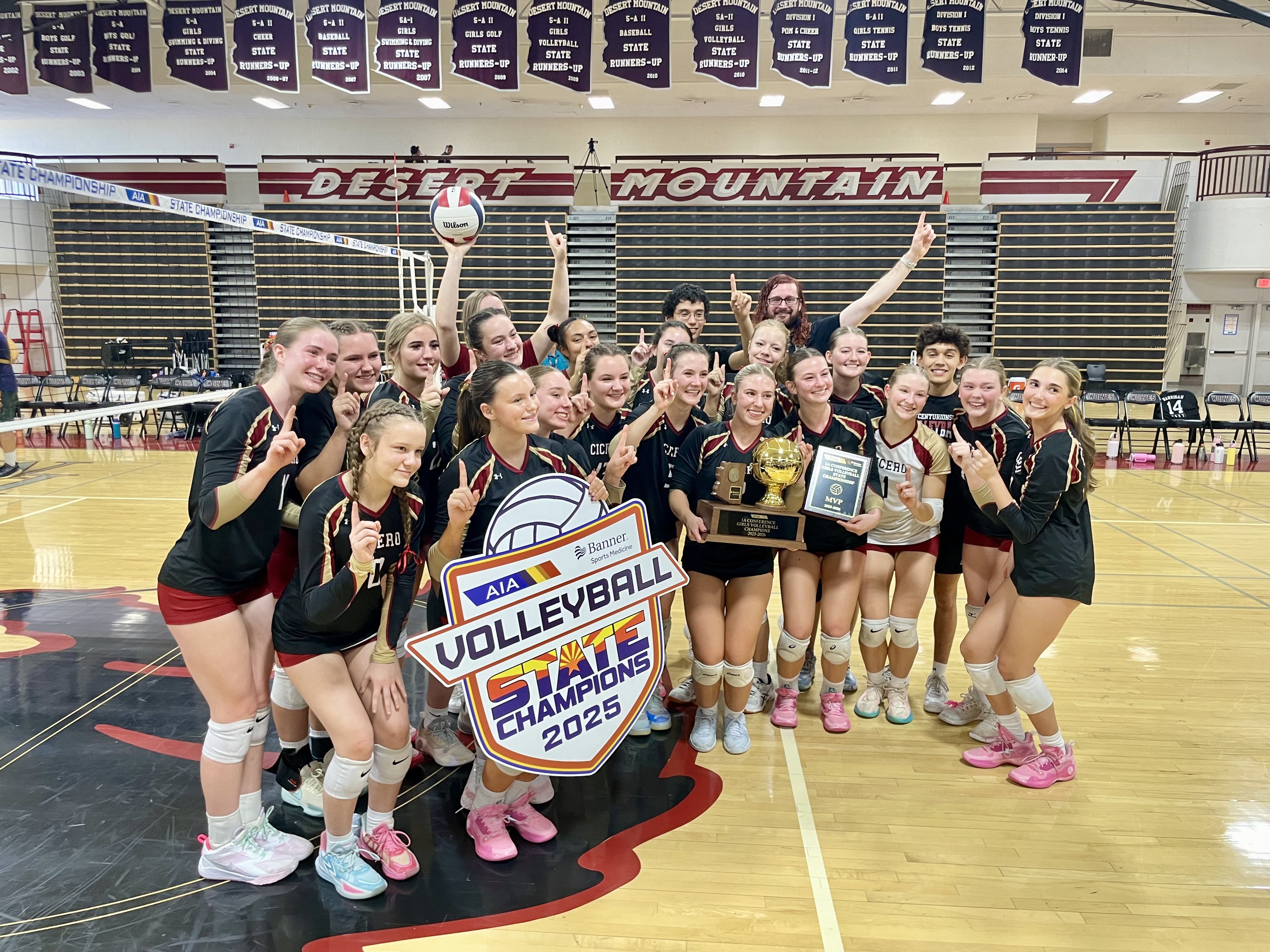 The top-seeded Centurions three-peated as 1A volleyball champs after defeating upset minded Great Hearts Anthem 25-13, 25-17, 23-25, 25-18 at Desert Mountain High School. In 2021, when head coach Kirsten Frey and assistant Brian Kirk took over a program that won just three matches the previous season, the duo unfurled their plans to build a champion.