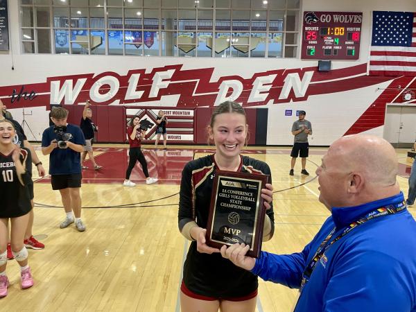 Nicole Damian received MVP honors from Dr. Jim Dean, the Arizona Interscholastic Association's Executive Director, after Saturday's dominant performance. (Jose Garcia photo/AZPreps365)The victory sent Ella Palamo, the lone senior for Cicero, out as a champ in her final high school match.